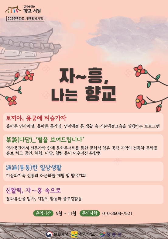 [남도저널 양용숙 기자] 장흥군은 문화재청에서 공모 2024년 지역문화유산 활용사업의 일환인 향교·서원 문화유산 활용사업에 ‘자∼흥, 나는 향교’가 선정됐다고 밝혔다.