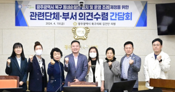 [남도저널 이운현 기자] 광주 북구의회 김건안 의원(우산동,문흥1·2동,오치1·2동)이 지난 19일 ‘광주광역시 북구 동네순찰단 설치 및 운영 조례’ 제정을 위한 관련단체 및 부서 의견수렴 간담회를 개최했다.