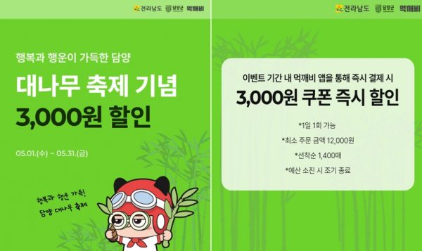 [남도저널 김종민 기자] 담양군은 오는 5월 11일부터 15일까지 개최되는 제23회 담양 대나무 축제의 성공을 기원하며 5월 한 달간 공공배달앱 ‘먹깨비’ 특별 쿠폰 발행 이벤트를 실시한다.