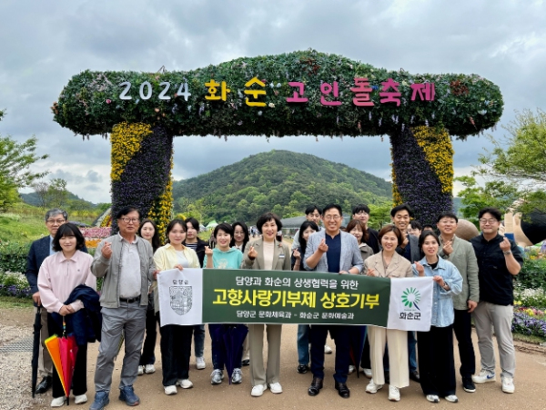 이날 담양군 문화체육과 직원들은 화순군 문화예술과 직원과 함께 화순군에서 열린 고인돌 봄꽃 축제장을 방문해 서로의 지자체에 기부하고 지역의 특산품도 홍보하며 상호 협력을 약속했다.