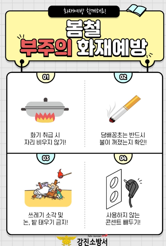 [남도저널 양용숙 기자] 강진소방서는 화재 발생이 증가하는 봄철, 부주의에서 비롯되는 화재에 대한 각별한 주의를 당부한다고 24일 밝혔다.