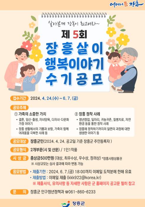 [남도저널 양용숙 기자] 장흥군이 제5회 장흥살이 행복이야기 “살아본께 장흥이 최고여라” 수기 공모전을 개최한다.