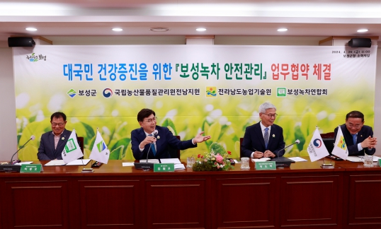 [남도저널 서인호 기자] 보성군과 국립농산물품질관리원 전남지원은 26일 전라남도 농업기술원, 보성녹차연합회와 함께 보성군청 소회의실에서 대국민 건강 증진을 위한 ‘보성녹차 안전관리’ 업무 협약을 체결했다고 밝혔다.