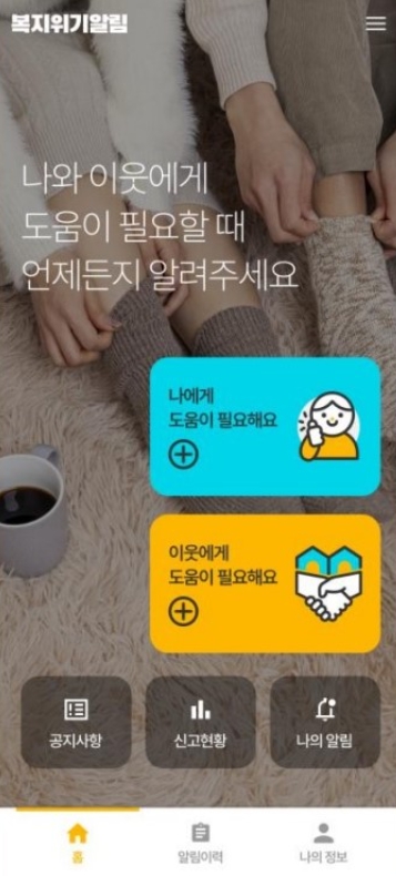 복지위기알림 앱은 보건복지부와 사회보장정보원이 주민들의 위기가구 발굴 신고를 활성화하기 위해 만든 것으로 언제 어디서든 본인 또는 이웃의 복지위기 상황 발생 시 앱을 통해 쉽게 도움을 청할 수 있다.