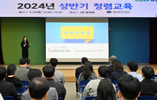 [남도저널 김홍열 기자] 광주광역시 서구는 29일 김이강 서구청장을 비롯해 간부공무원, 승진자, 신규자 등 공직자 100여 명을 대상으로 ‘우리와 가까운 청렴’이라는 주제로 청렴교육을 실시했다.