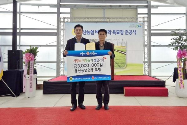 29일 용산농업협동조합은 농업인의 일손부족 해결 및 농가 편익을 제공하기 위해 벼 자동화 육묘장 준공식을 개최하고 어려운 이웃을 돕는 데 써달라며 성금 300만 원을 기탁했다.