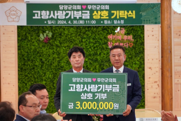 [남도저널 김종민 기자] 담양군의회와 무안군의회는 지난 30일, 고향사랑기부제 활성화와 지역 간 상생발전을 위해 담양읍 담소정에서 고향사랑기부금을 상호 기부하는 기탁식을 가졌다.