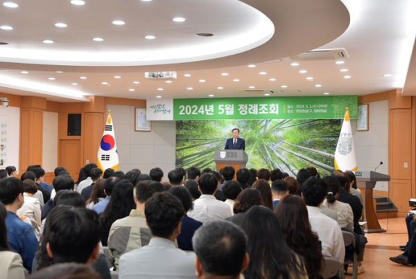 [남도저널 김종민 기자] 담양군은 지난 1일 군청 면앙정실(구. 대회의실)에서 공직자 200여 명이 참석한 가운데 5월 정례조회를 개최했다. 이날 정례조회는 어린이날과 보건의 날 유공대상자에 대한 표창도 함께 진행됐다.