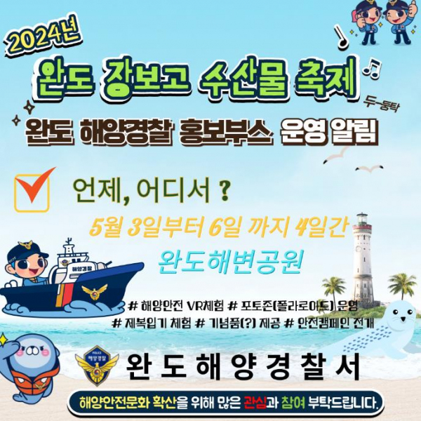 [남도저널 양용숙 기자] 완도해양경찰서는 적극행정(정부혁신)의 일환으로 2024년 완도 장보고수산물축제가 열리는 완도군 해변공원 일원 행사장에서 5월 3일부터 6일까지, 4일간 해양경찰 홍보부스를 운영한다고 2일 밝혔다.