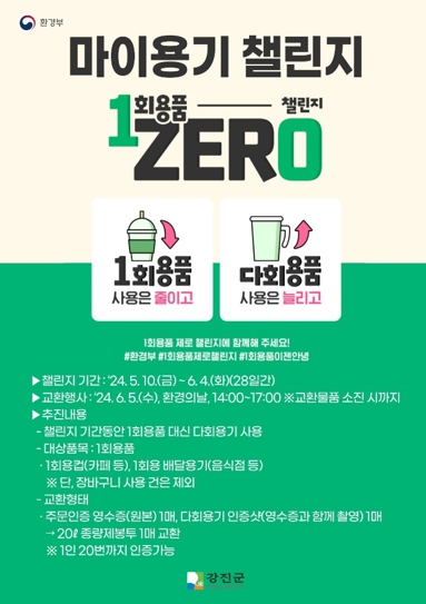 [남도저널 양용숙 기자] 강진군은 자원의 낭비와 폐기물 발생 최소화를 위한 1회용품 사용 줄이기를 홍보하고, 지속가능한 자원순환사회 조성을 위한 주민들의 동참을 유도하기 위해 ‘마이용기 챌린지’를 펼친다고 3일 밝혔다.