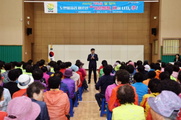 대덕읍 복지회관에서 진행된 이날 행사는 노인일자리 참여자 어르신 카네이션 달아드리기, 레크리에이션, 선물 꾸러미 증정 등의 시간을 가졌다.