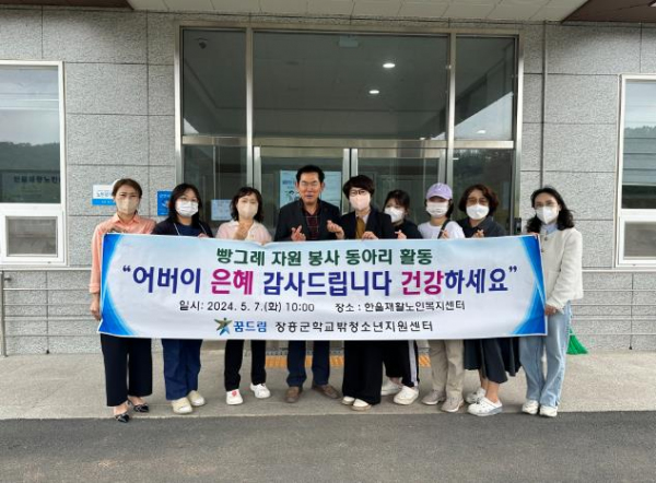 [남도저널 양용숙 기자] 장흥군학교밖청소년지원센터 꿈드림 봉사동아리 ‘빵그레’는 가정의 달을 맞이하여 5월 7일 동아리 활동시간에 쿠키를 만들어 한울재활노인복지센터를 방문하여 어르신들에게 나눔 하는 시간을 가졌다.