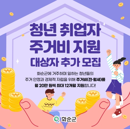 [남도저널 김용범 기자] 화순군은 7일 ‘청년 취업자 주거비 지원 사업’ 대상자 10명을 오는 9일부터 24일까지 추가로 모집한다고 밝혔다.