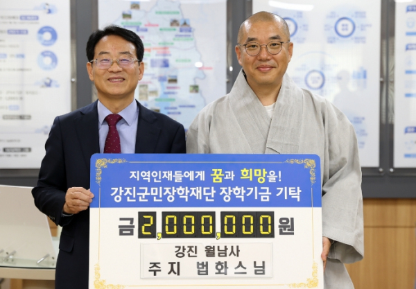 [남도저널 양용숙 기자] 지난 7일, 대한불교조계종 월남사 주지, 법화스님이 2백만원의 장학금을 강진군민장학재단(이사장 강진원)에 기탁했다.