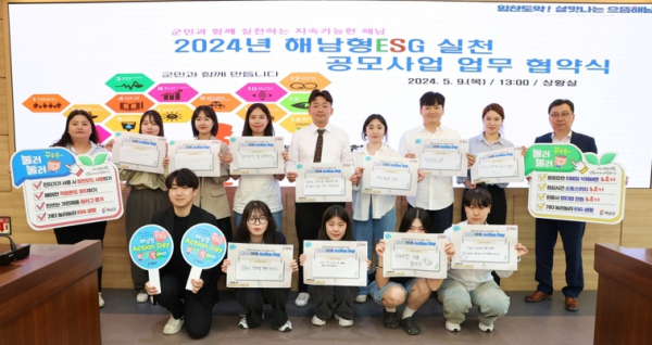 해남군은 2024년 해남형ESG 실천 공모를 실시, 해남공업고등학교와 해남청년연합회,초효 등 3개 단체를 선정해 사업시행을 지원한다. 주민들이 스스로 실천 과제를 발굴하고, 시행하는 주민 참여형 ESG 실천 사업으로 큰 관심을 모으고 있다.