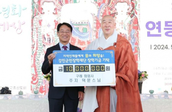 [남도저널 양용숙 기자] 구례 지리산 화엄사 주지 덕문스님이 지난 10일 불기 2568년 부처님 오신 날 기념 군민 연등축제를 맞아 장학금 1,000만원을 강진군민장학재단에 기탁했다.