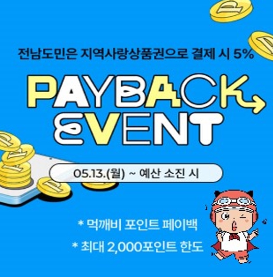 [남도저널 양용숙 기자] 전남 도내 소상공인의 수수료 부담 완화와 지역경제 활성화를 위해 운영 중인 공공배달앱 ‘먹깨비’에서 지난 13일부터 지역사랑상품권 결제 때 5% 페이백 이벤트를 시작했다.