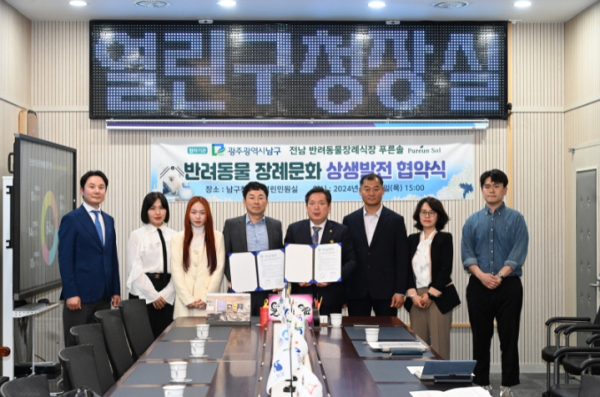 남구는 최근 관내 반려인의 동물화장 민원을 해소하고, 성숙한 반려 문화 조성을 위해 전남의 한 반려동물 장례식장인 푸른솔과 상생 발전 협약을 체결했다.