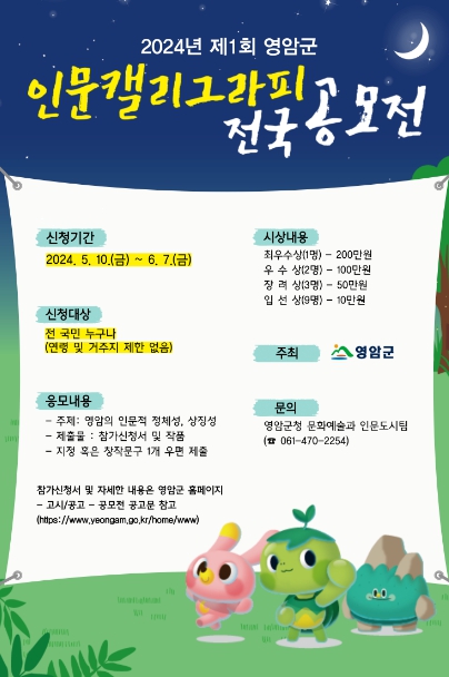 [남도저널 김승귀 기자] 영암군이 ‘2024년 제1회 영암 인문 캘리그라피 전국 공모전’ 접수를 6/7일까지 실시한다.