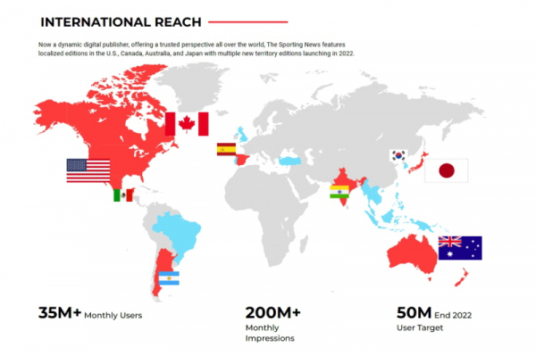 TSN은 세계 탑 스포츠전문 뉴스언론인 '스포팅뉴스 The Sporting News’를 소유한 글로벌 미디어 그룹이다. 스포팅뉴스는 미국에서 1886년 스포츠 전문 매거진으로 시작하여 스포츠 일간지로 발행됐다가 현재는 스포츠 온라인뉴스 서비스와 스포츠 데이터 정보를 서비스하고 있다. 세계 10개국에 공식 서비스하고 있으며 전세계 월 5천만명 이상이 이용하고 있는 글로벌 스포츠전문 뉴스매체이다.
