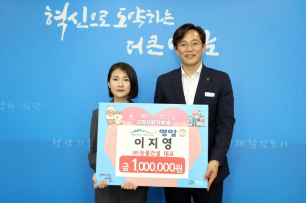 [남도저널 김승귀 기자] 이지영 늘봄건설 대표가 20일 영암군청에서 고향사랑기금 100만원을 기부했다.