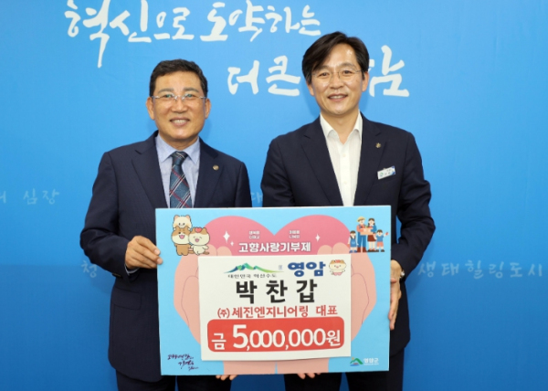 [남도저널 김승귀 기자] 박찬갑 세진엔지니어링 대표가 23일 영암군청을 찾아 지역발전을 위해 써달라며 고향사랑기금 500만원을 기부했다.