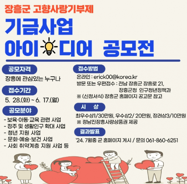 [남도저널 양용숙 기자] 장흥군이 고향사랑기부제 활성화 및 지역 여건을 반영한 고향사랑기금사업 아이디어 제안 공모전을 개최한다고 밝혔다.