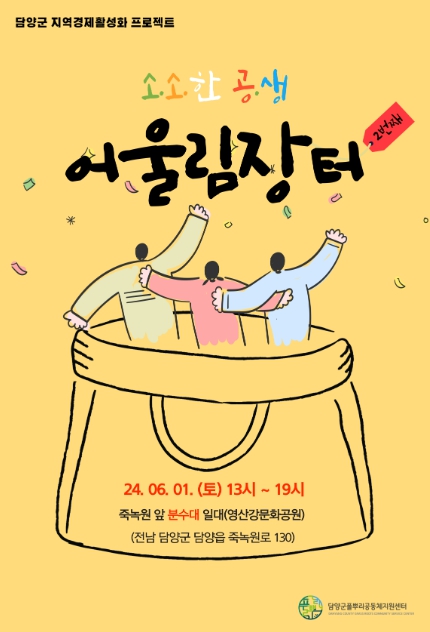 [남도저널 김종민 기자] 담양군과 담양군풀뿌리공동체지원센터는 오는 6월 1일 영산강 문화공원 일대에서 ‘소소한 공생, 어울림장터’를 개최한다.