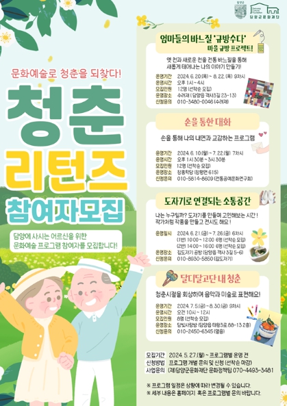 [남도저널 김종민 기자] (재)담양군문화재단이 ‘청춘리턴즈’ 4개 프로그램에 참여할 만 60세 이상 군민을 모집한다.
