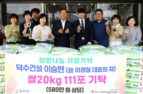 [남도저널 양용숙 기자] 덕수건설 故 이경철 대표의 장남 이승현씨가 지난 21일 580만원 상당의 백미 20kg 111포를 강진군에 어려운 이웃에게 전달해달라고 기탁했다.