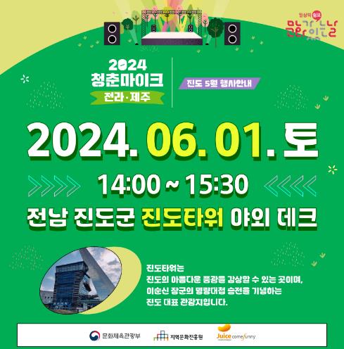 [남도저널 김승귀 기자] 진도군 군내면 진도타워 야외 공연장에서 오는 6월 1일 오후 2시부터 1시간 30분간 ‘청춘마이크’ 공연이 열린다.