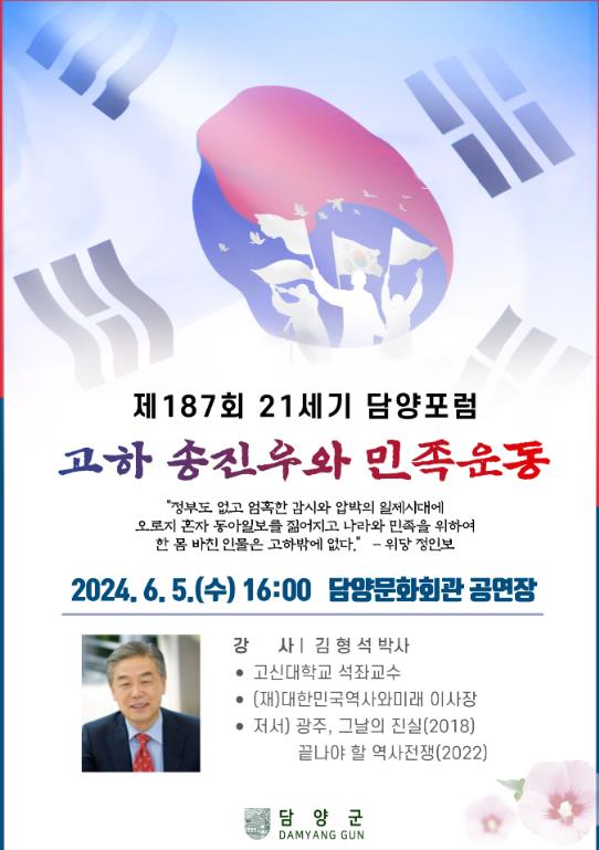 이번 강좌는 6월 호국보훈의 달을 맞아 보훈 문화를 확산하고 애향심과 애국심을 고취하고자 (재)대한민국역사와미래 김형석 이사장을 초청, 담양에서 태어난 항일 독립과 민주 건국의 지도자인 고하 송진우 선생에 대한 강연을 진행한다.