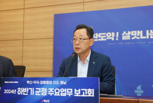 특히 해남군은 민선8기 후반기를 해남의 20년, 30년을 좌우할 장기성장동력을 확보하는데 주력할 방침으로, 기회발전특구 지정, 해양관광레저거점 조성, 고속철도 해남노선 국가계획 반영 등 3대 역점사업을 비롯해 국립농식품기후변화대응센터 및 농업연구단지 조성, 탄소중립 에듀센터 및 녹색융합 클러스터 조성, 수산양식기자재 클러스터 조성, 김치원료공급단지 조성 등 주요사업의 차질없는 추진에 더욱 속도를 높일 계획이다.