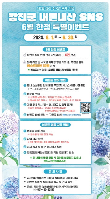[남도저널 양용숙 기자] 강진군이 소상공인 살리기를 목적으로 진행 중인 ‘내돈내산 SNS 리뷰 이벤트‘를 제2회 강진 수국길축제를 기념해 6월 한달간 특별 이벤트로 진행한다고 밝혔다.