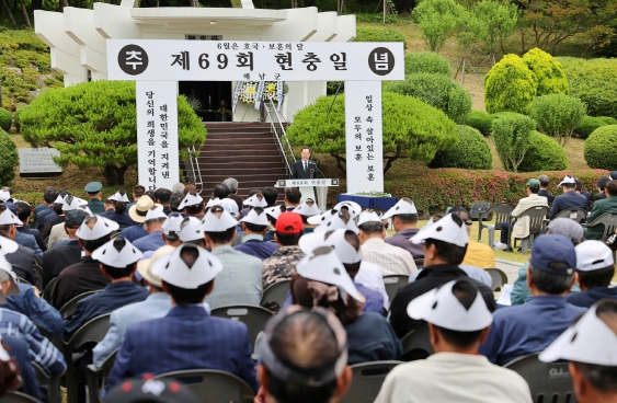 [남도저널 김승귀 기자] 해남군은 6일 해남읍 우슬체육공원 내 현충탑 일원에서 순국선열 및 국가유공자의 숭고한 나라사랑 정신을 기리는 제69회 현충일 추념식을 가졌다.