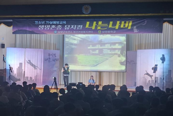 [남도저널 김종민 기자] 담양군이 지난 10일 담양중학교 전교생과 교직원을 대상으로 자살예방 및 생명존중문화 확산을 위한 ‘나는 나비’ 교육 뮤지컬 공연을 진행했다.