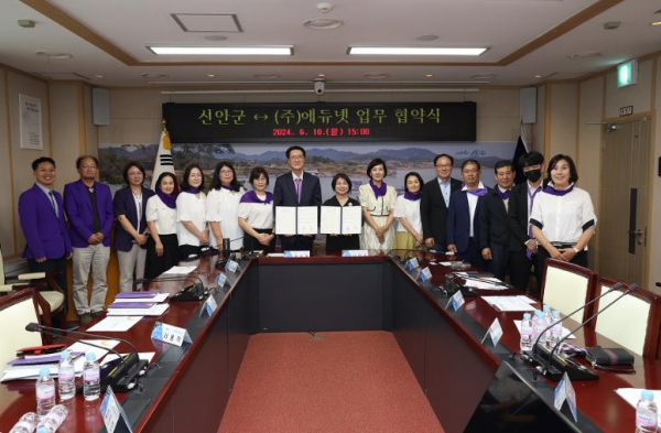 [남도저널 봉현구 기자] 신안군은 지난 10일 군청 영상회의실에서 어린이집 교직원 교육 전문기관 ㈜에듀넷과 아동·보육교직원 및 부모 역량 강화를 위한 업무협약을 체결했다.
