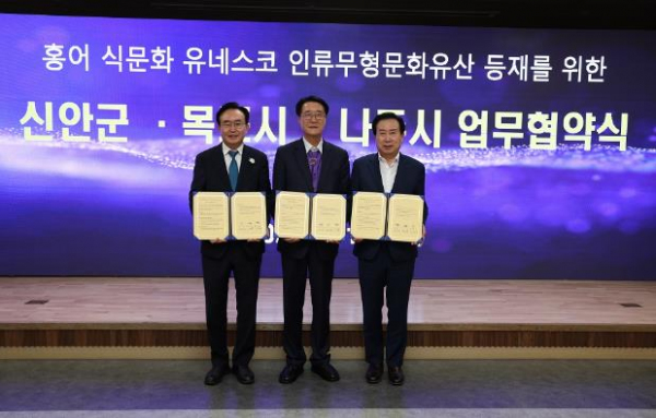 [남도저널 봉현구 기자] 신안군은 6월 13일 무안군 승달문화예술회관에서 목포시, 나주시와 ‘홍어식문화 유네스코 인류무형유산 등재 공동 추진을 위한 업무협약(MOU)’을 체결했다고 밝혔다.