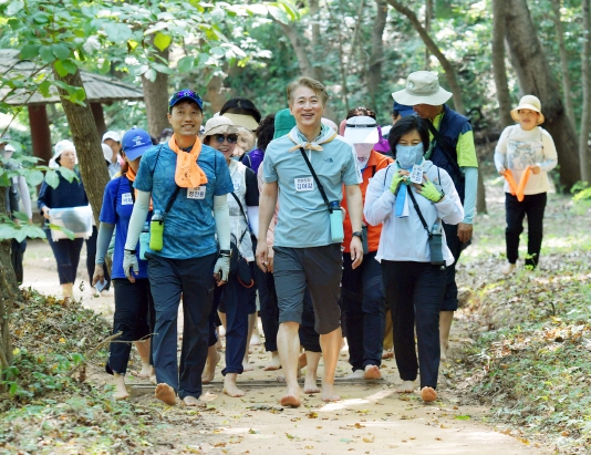 김이강 광주광역시 서구청장, 주민들과 맨발로 소통 [남도저널 김홍열 기자] 김이강 광주 서구청장은 15일 오전 맨발걷기 주민동호회 회원들과 함께 서구 매월동 '백마산 맨발로'를 걸으며 소통시간을 가졌다.