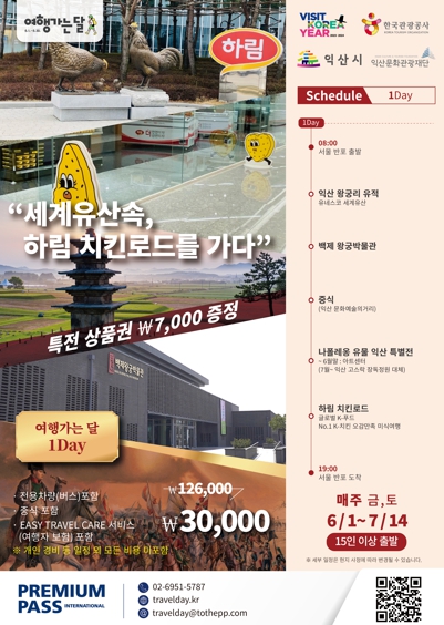 한편 익산시는 6월 여행가는 달을 맞아 '세계유산속 하림 치킨로드를 가다'라는 상품을 판매 중이다. 다음달 14일까지 매주 금, 토 15인 이상 모객 시 운영하며 서울 반포에서 출발해 익산 왕궁리유적, 나폴레옹 유물 전시관, 하림 치킨로드를 방문한다.