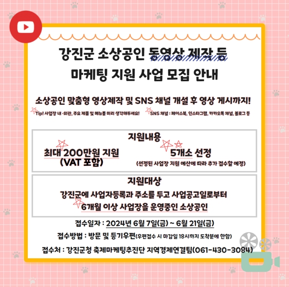 해당 사업지원 대상자는 강진군에 사업자등록과 주소를 두고 사업 공고일로부터 6개월 이상 사업장을 운영 중인 소상공인으로 동영상 제작 등 사업 진행을 위해 발생하는 비용은 개소당 최대 200만원 한도까지 지원하며, 선정된 업체에 대하여 군에서 일괄 제작해 배포할 계획이다.