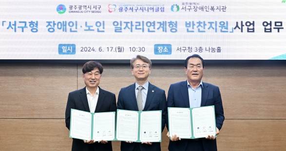 [남도저널 김홍열 기자] 광주광역시 서구가 장애인‧노인 공공일자리 협업을 통해 복지 사각지대 해소에 나선다. 서구는 17일 서구청 나눔홀에서 광주서구시니어클럽, 광주광역시 서구장애인복지관과 서구형 장애인-노인 일자리 연계형 반찬지원사업 업무협약을 체결했다.