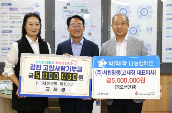 [남도저널 양용숙 기자] 강진군은 지난 20일, ㈜서천양행 고재경 대표이사가 선친 고광철 회장의 유지를 받들어 강진의 발전을 위해 고향사랑기부금 500만원 및 강진군 보전마을 경로당에 500만원 등 총 1천만원을 기탁했다고 밝혔다.