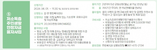 영암군이 자립 의지와 자활 능력이 있는 저소득 위기가구에 생활안정자금 융자를 지원하는 사업 참여자를 수시 모집하고 있다.