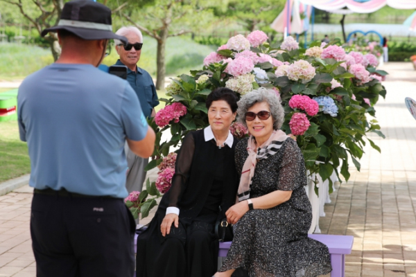 축제장을 찾은 관광객들이 저마다 휴대폰으로 사진찍기에 여념이 없다. 내가 예쁠까. 수국이 예쁠까. 신랑들은 말없이 미소만 지었다.