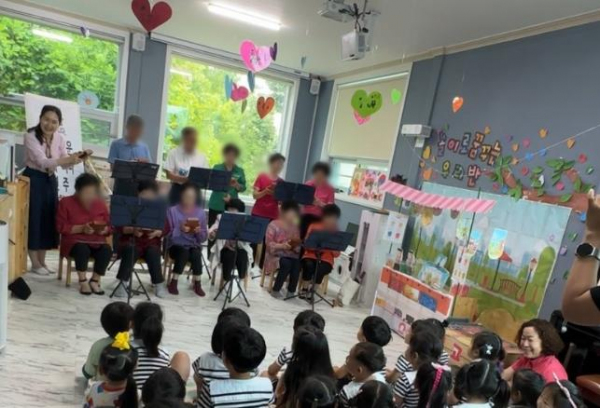 이번 2차 공연에서는 어르신들이 어린이집을 방문해 노인문화대학 수업에서 배운 악기들을 연주하는 재능기부 공연을 펼쳤다.