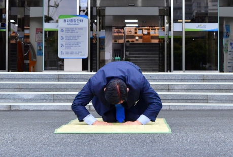 [남도저널 김종훈 기자] 김한종 장성군수가 민선8기 후반기 첫날인 1일 오전 청사 앞에서 군민을 향해 큰절을 올렸다. ‘군민을 섬기는 군정’을 상징하는 김 군수의 큰절은 2022년 취임 이후 민선8기 출범일과 시무식 날마다 어김없이 이어지고 있다.