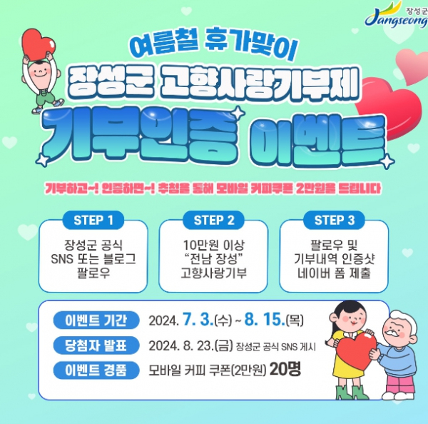 [남도저널 김종훈 기자] 장성군이 고향사랑기부제 활성화 및 기부 참여 확산을 위해 여름철 휴가 맞이 ‘고향사랑기부 인증 이벤트’를 연다.