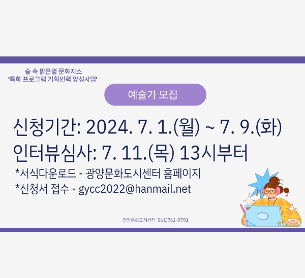 현재 오는 9일까지 광양시를 생활권으로 하는 예술가와 예술강사를 대상으로 참여자 신청을 받고 있다.