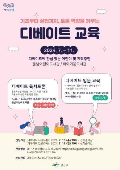 신청은 광산구 통합도서관 누리집에서 온라인으로 접수한다. 운남어린이도서관 ‘디베이트 독서토론’은 10일부터, 이야기꽃도서관 ‘디베이트 입문 교육’은 8월 12일부터 신청할 수 있다.